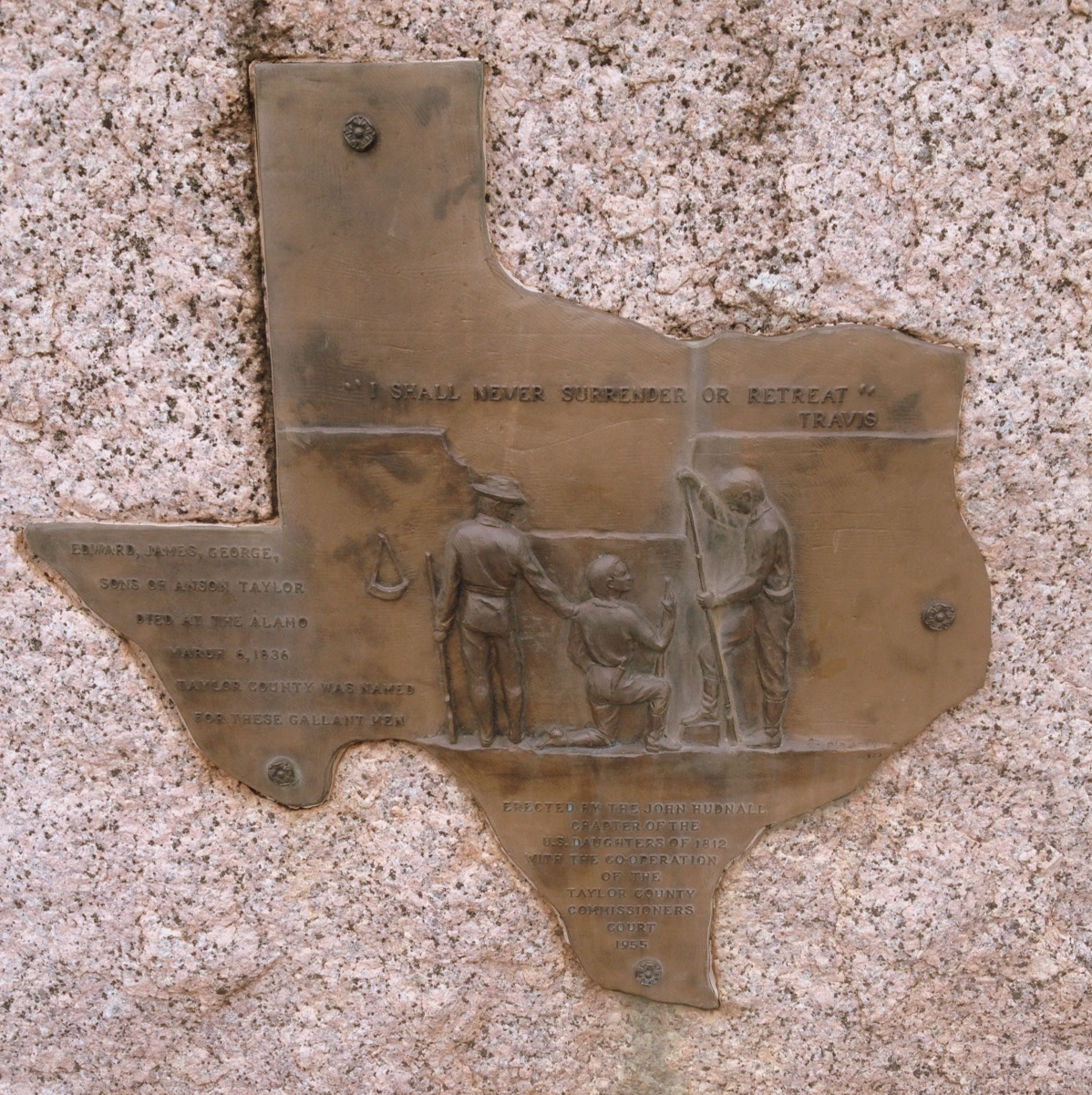The county is named for three brothers, Edward, George and James Taylor who all died at the Alamo, it is generally thought. All three were privates in the army of Alamo defenders. Their parents were Anson and Elizabeth Taylor. The town of Anson is also located nearby in Jones County just to the north, but it is not named for their father. Most accounts state that immediately before they joined the Army, they were employed picking cotton on the farm of a Captain Dorsett in Liberty, Texas when news circulated of revolution. Once they had completed the job, they joined the Army of the Texas Revolution.