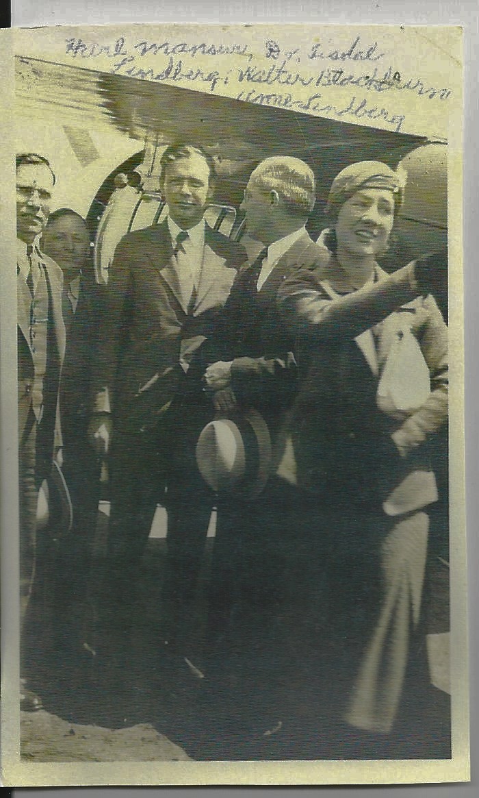 Above is a photo of Lindbergh taken a few years later (perhaps in April, 1933) that we think was given to our grandmother by her brother Bill. Uncle Bill was head of the Elk City Chamber of Commerce around this time. We don’t know the exact date of the picture, but was taken in Elk City, Oklahoma which was not on the original Guggenheim Tour route. We think the occasion was probably connected to the merger of the two airlines that formed TWA. Pictured from left to right are some local individuals, Lindbergh and his wife Anne Morrow Lindbergh. He had met Anne while on a goodwill tour to Mexico in December, 1927 and the couple were married May 27, 1929. They are standing in front of a high winged aircraft that was not the “Spirit of St. Louis.” In May of 1928, Lindbergh had flown the “Spirit” to Bolling Field in Washington, DC and donated the famous aircraft to the Smithsonian Institution, where it has been displayed ever since. It is said that Lindbergh had developed quite an attachment to the plane. By the time the “Spirit” was retired, Lindbergh recounted that he had recorded flying in the historic plane for 489 1/2 hours in 174 flights that included the 48 states and 19 foreign countries.