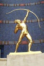 After a number of individuals were considered, Eugene Savage of New York was chosen to paint murals for the interior of the Hall of State and Allie Tennant was chosen to create a sculpture to be installed above the main entrance in an alcove. Tennant’s work was created in her studio on Live Oak Street, several miles from Fair Park. In his book, Light Townsend Cummins relates that Tennant had considered a number of possible subjects, finally settling on a Native American warrior of the Tejas tribe from which the name of the state is derived. The name Tejas refers to an early group of native individuals who inhabited the area hundreds of years ago. Over time, they were likely either killed in clashes with other tribes and/or assimilated into them. Wanting to evoke the spirit of these early inhabitants, Tennant began working on the piece in 1936 and completed the plaster cast in early May. It was then sent to the Roman Bronze Works in Queens, New York for casting in bronze and gold leaf and returned to Dallas in early July of 1936. Since then, this beautiful work which she named Tejas Warrior has crowned the entrance to the Hall of State Building.