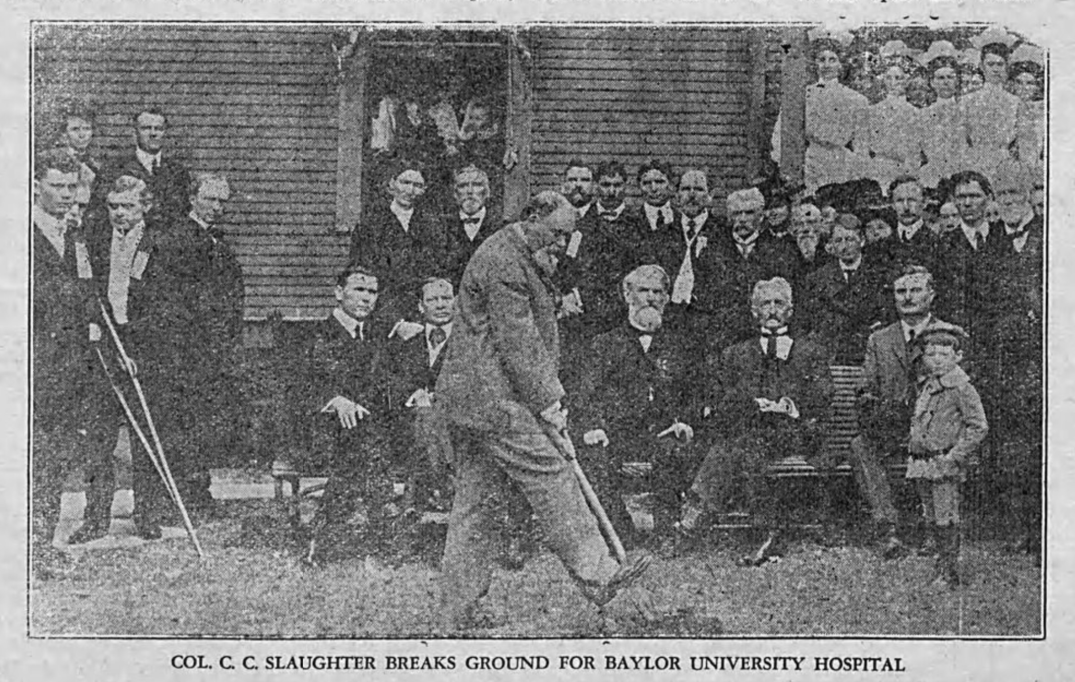 Buckner appeared in the famous photo taken at the Saturday November 5, 1904 groundbreaking for a new hospital to be called Texas Baptist Memorial Sanitarium, later to be known as Baylor University Medical Center. Its charter had been granted by the State of Texas the previous October. Buckner is seated immediately to the right behind C. C. Slaughter (standing with the shovel), along with George W. Truett, J. B. Gambrell, Robert Coleman, Drs. Rosser, Cary and Lorenz and others.
