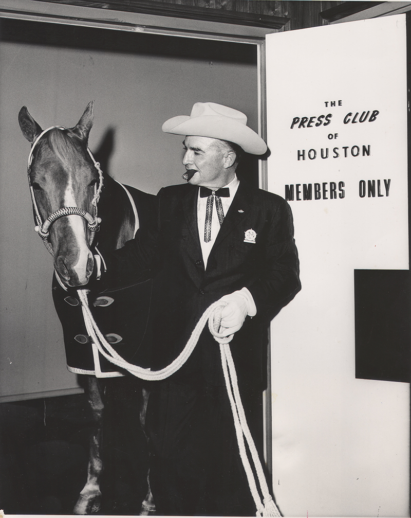Rex Cauble was born August 15, 1913 in the Hill County town of Vaughan, Texas. His parents were Fred C. Cauble and Lou Butts Cauble who were cotton farmers. One of his first jobs was in the oilfield where he worked as a roughneck. He tried his own hand at drilling and was successful at that, as well. Always fond of ranch life, Cauble invested in horses, was a very good competitive rider in the 1960s and came to own a prize stud named Cutter Bill. Settling in North Texas, Cauble founded two western wear stores, named after his cutting horse. The stores were branded Cutter Bill’s Western World with locations in Houston and Dallas in the late 1960s. At the opening of the Houston store, the horse was brought in and his hoof prints were imprinted in the wet cement of the sidewalk.