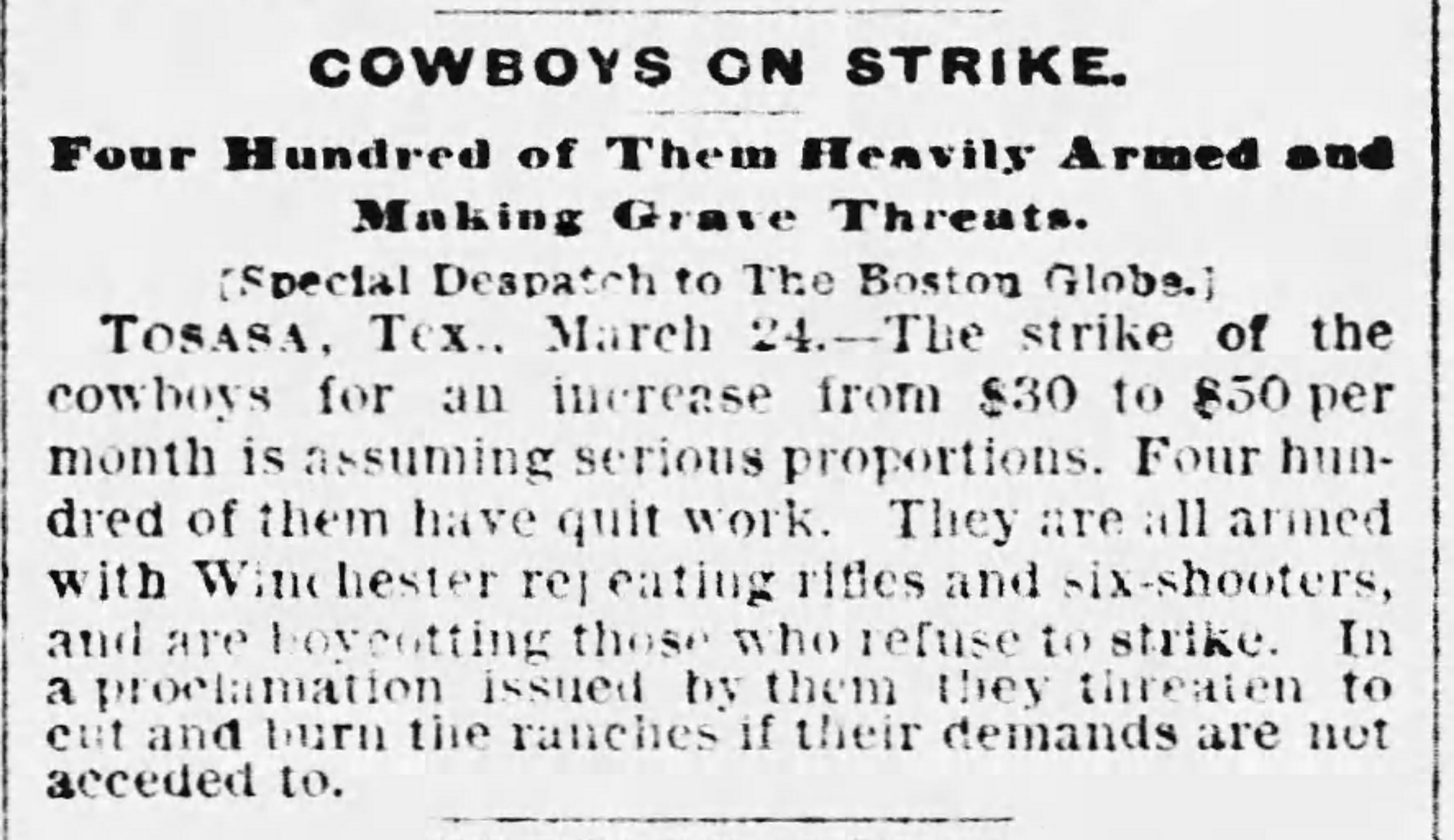 In the spring of 1883, the newspapers like the Boston Globe reported that hundreds of cowboys went on strike for higher wages. The next day, a Wyoming newspaper gave more details, repeating the $50 per month demand. This article alluded to the possible threats of danger facing cowboys who declined to participate in the strike, but gives the number of strikers to be two hundred. Both have typographical or transcription errors. “Tosasa” in the Boston Globe article is probably a misspelling of Tascosa. The Wyoming article calls the county of the strike “Lascasa” and places it near the Texas-New Mexico border. The articles begin to settle down in a few days and give the location to be Tascosa.