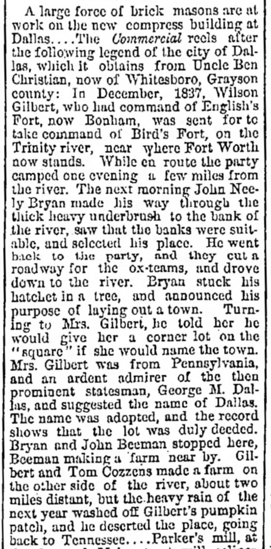The above is one of several legends about the town’s name. No one really knows the origin of the name of the city of Dallas, since John Neely Bryan did not document his reason for selecting the name in any source that has survived. Some may associate the legend with Mabel Gilbert, but Wilson Gilbert was married first to Nancy Kennedy and second to a woman whose name was Martha (last name unknown). It is unknown how long Wilson Gilbert lived in Dallas County. He apparently moved from Dallas back to Bonham, as did his brother Mabel Gilbert, and resided there until his death.