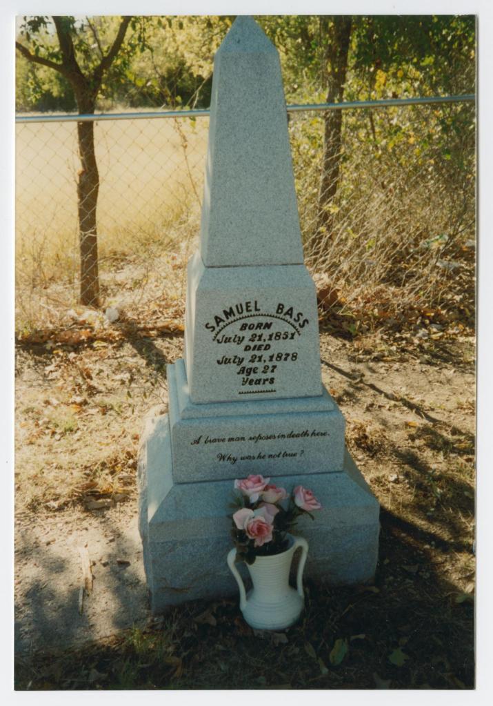 Bass is buried in Round Rock Cemetery, Below is an image of the current stone marking his grave. At least one photo, not shown here, apparently exists of his original stone but it was replaced with the current one after having been damaged by vandals and treasure seekers. Some genealogy accounts indicate that Sam was married and that he had one or more children. Given his lifestyle and timeline, that is unlikely and we would conclude than any such account is in error.