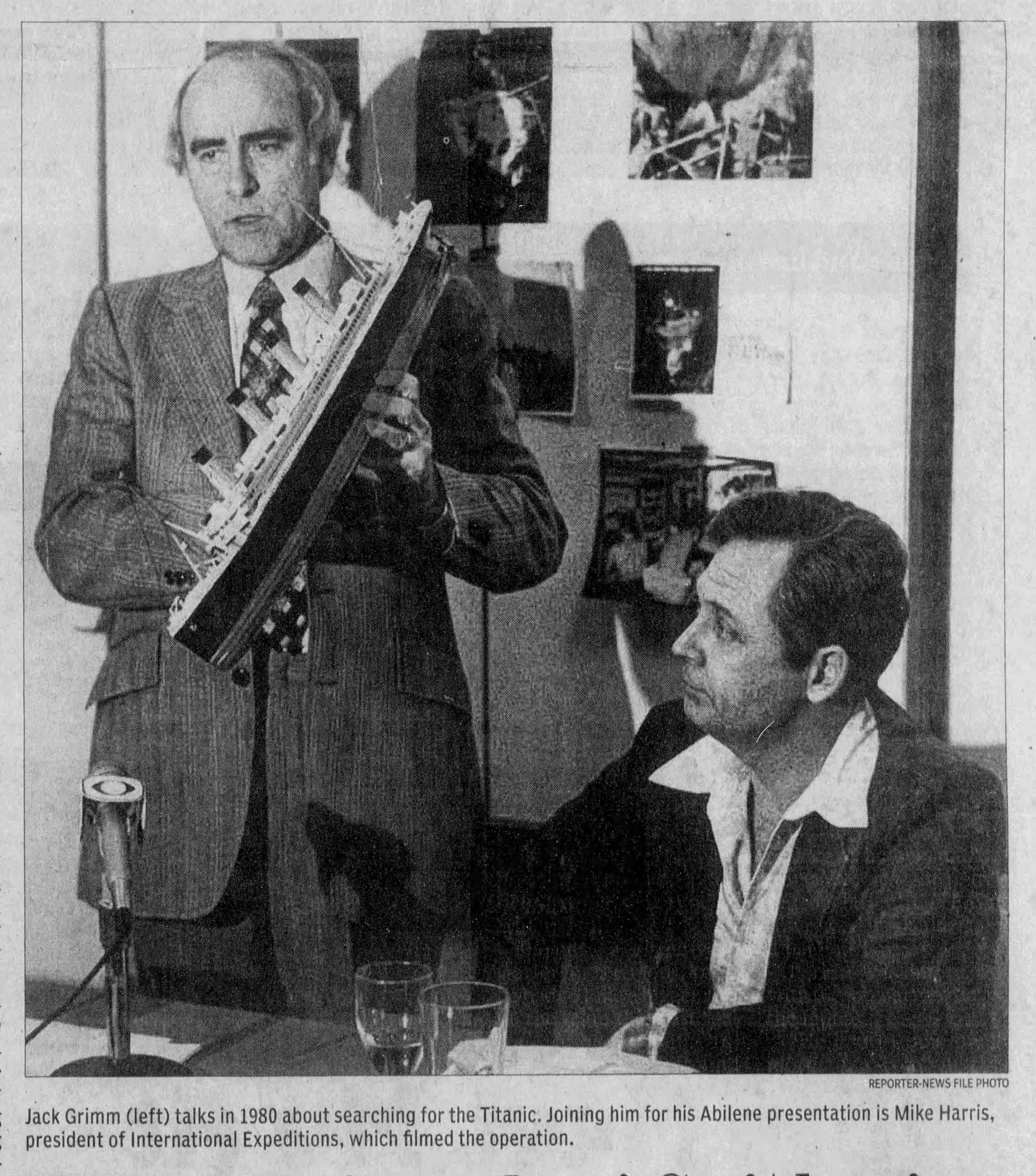 In 1979, Grimm was part of an effort to locate the sunken ocean liner Titanic, which by now most everyone would know sank in the Atlantic Ocean in 1912, even if they might not know the year it occurred. Though there were many survivors, some 1,500 lives were lost in the disaster. Another Abilene Reporter-News article from April 8, 2012 noted that Grimm’s interest in such an effort began when he was contacted by a Florida filmmaker named Michael Harris about searching for the ship. Grimm’s expeditions were well funded and staffed with scientists. Though it produced good results about the sea floor and the general location, actual credit for finding the Titanic was given to a later expedition in 1985 in which Grimm was not involved.