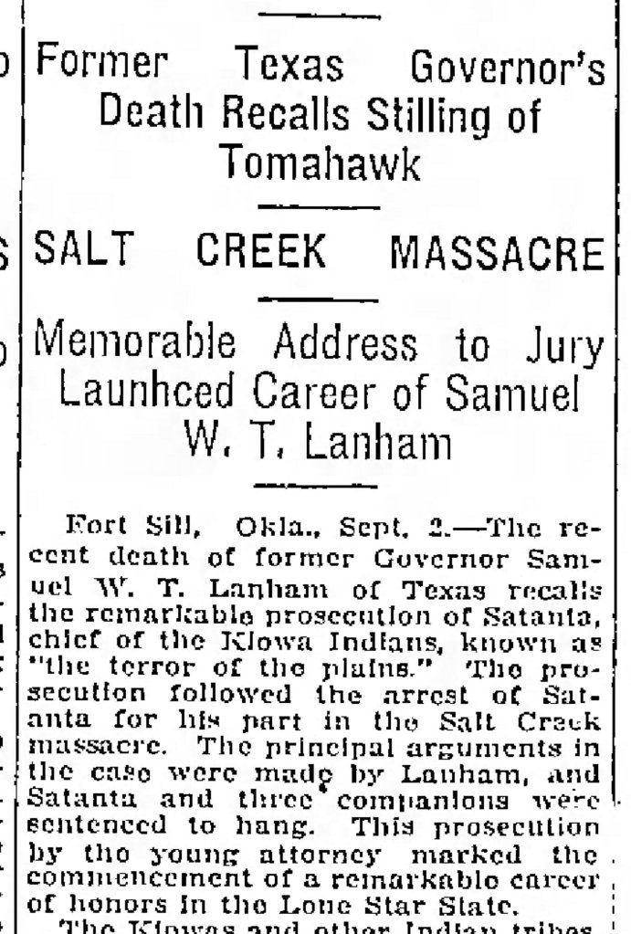 After Lanham’s 1908 death, an article in The Salt Lake Herald-Republican gave some details of the trial stating that Satanta addressed the jury through an interpreter, calling himself a friend of the Texans and stating that if he were to be acquitted, he vowed to hunt down and punish those Indians who had committed the Salt Creek attack. The suspects were convicted.
