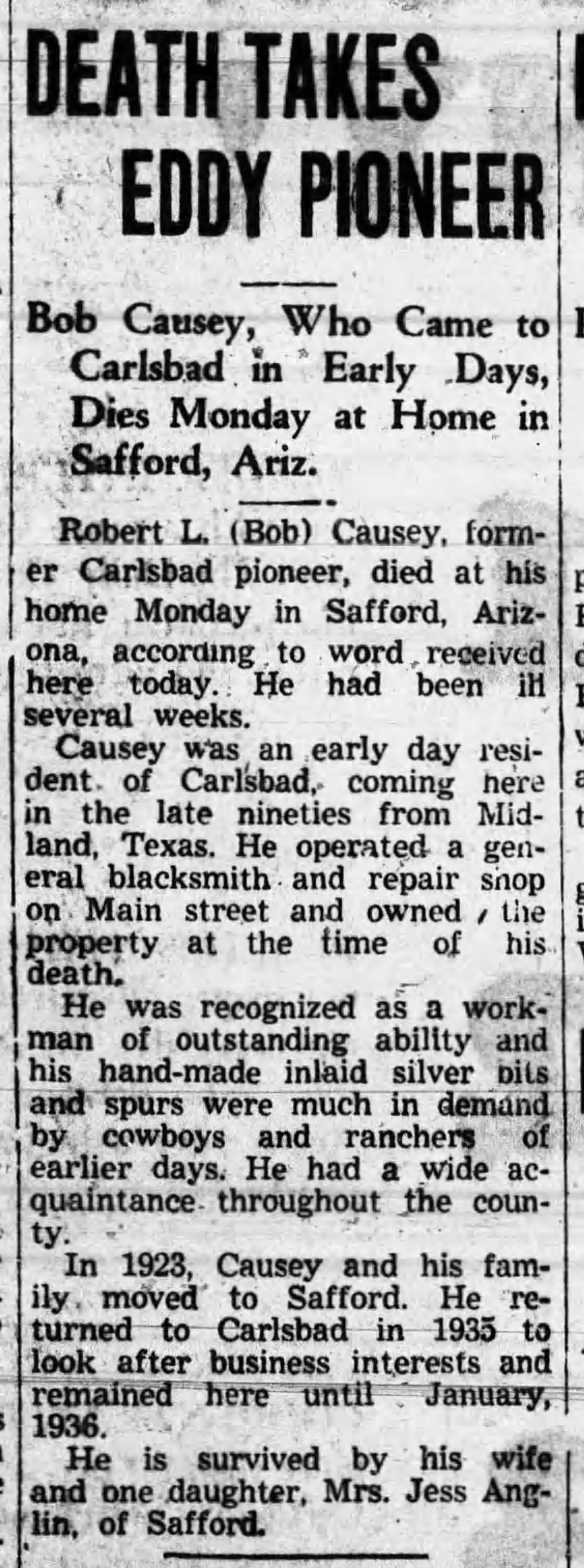 After a few other moves, he was finally drawn to move to Safford, Arizona in 1924. He remained there until his death in 1937. He is buried in Safford City Cemetery. His wife Martha Bogle Causey survived him by twenty-four years and is also buried in Safford City Cemetery.