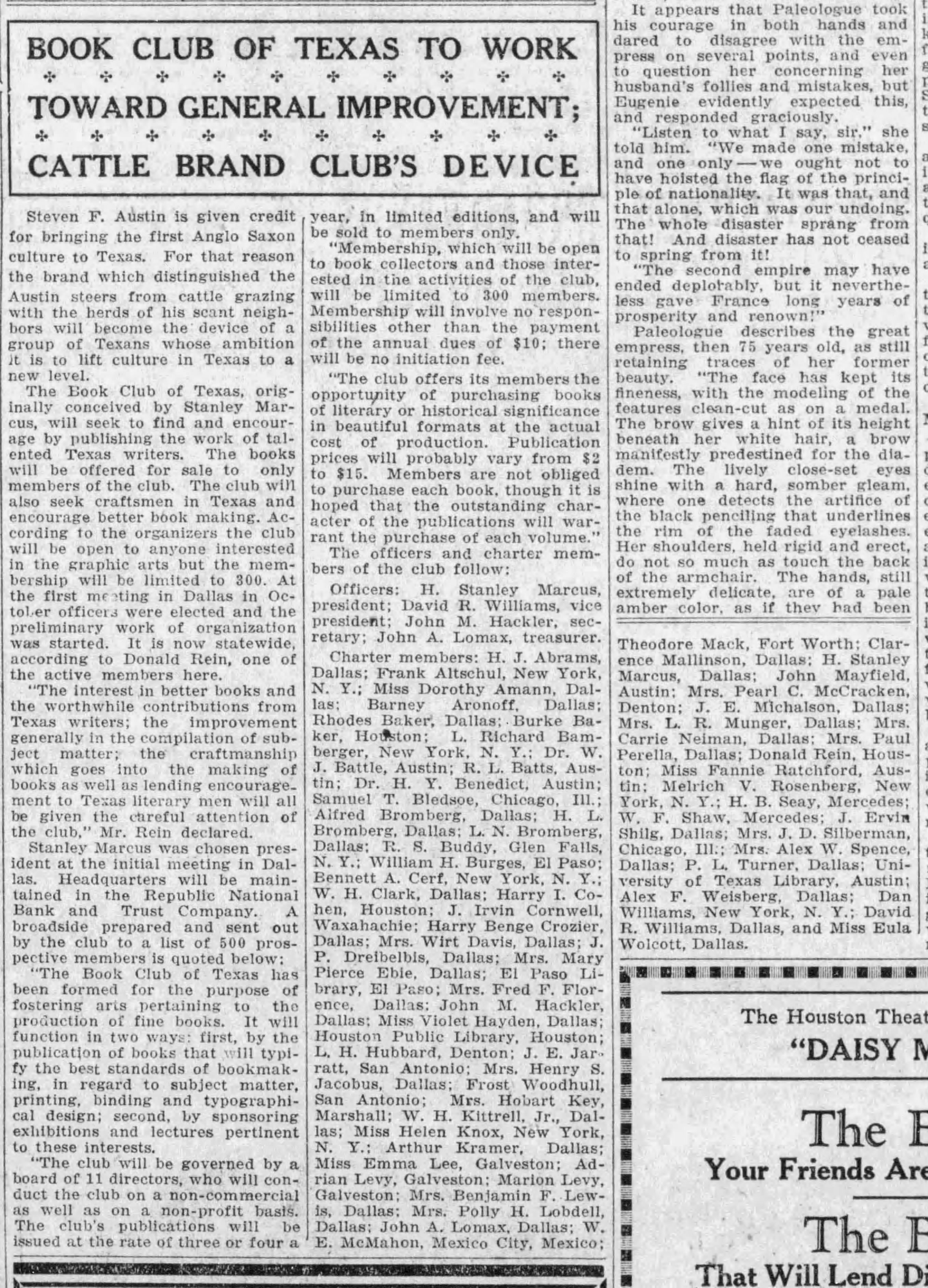 The organization known as the Book Club of Texas was conceived in late 1928 and formally created in 1929. Its purpose was laid out by Stanley Marcus of Dallas in a newspaper interview carried by the Houston Chronicle in its issue of November 25, 1928 in the copy below. Marcus said “The Book Club of Texas has been formed for the purpose of fostering arts pertaining to the production of fine books. It will function in two ways: first, by the publication of books that will typify the best standards of bookmaking, in regard to object matter, printing, binding and typographical design; second, by sponsoring exhibitions and lectures pertinent to these interests.” Marcus went on to describe the governance, membership and benefits to those who participate. The entity was set up as a not for profit and non commercial group and began operating in early 1929.