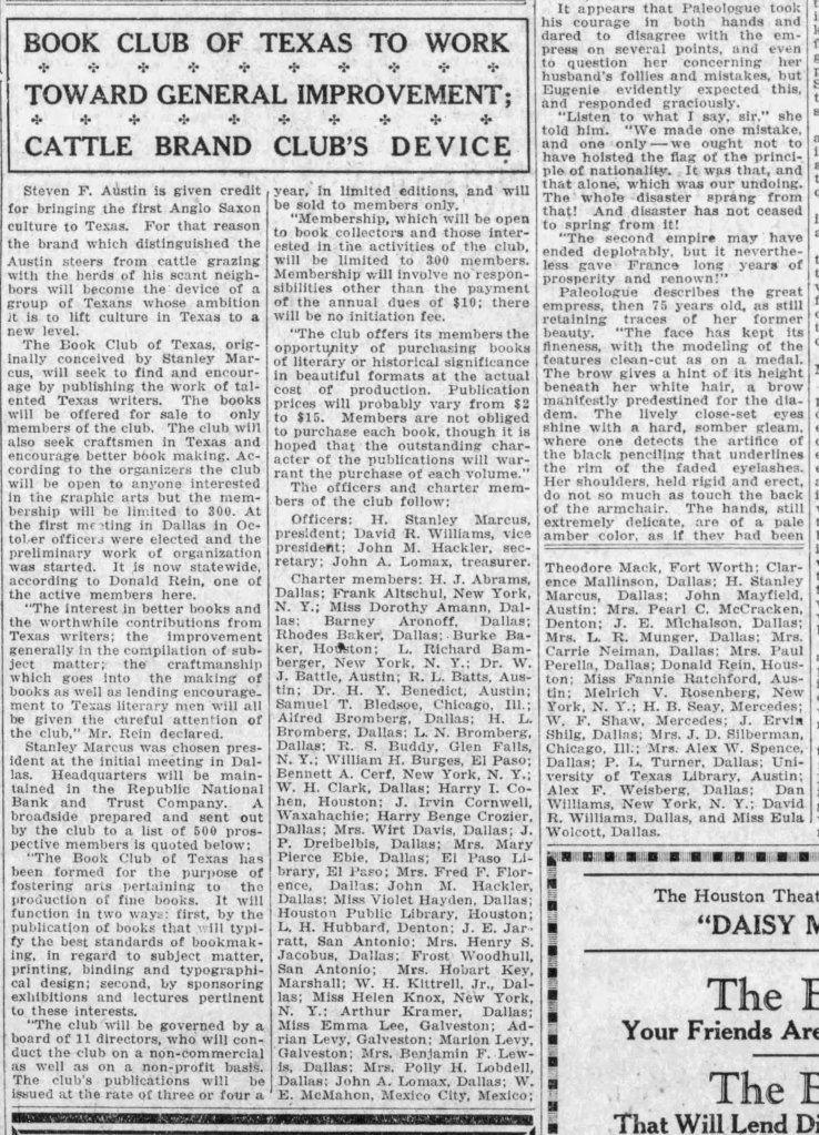 Charter members were from around the state, though many are from Dallas. Members would be invited to purchase books produced by the club, but would not be obligated to do so.