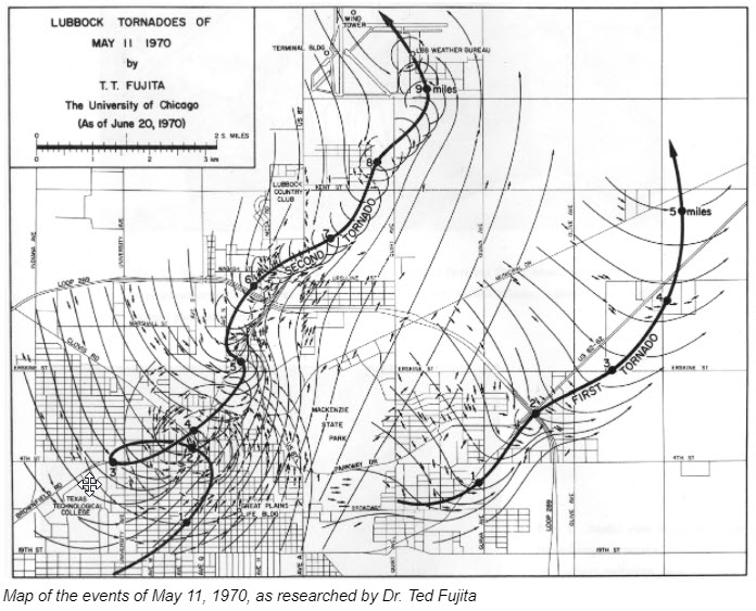 It was soon determined that there were actually two tornadoes that struck Lubbock. Below is Dr. T. Theodore Fujita’s map reconstructing the paths of both twisters.