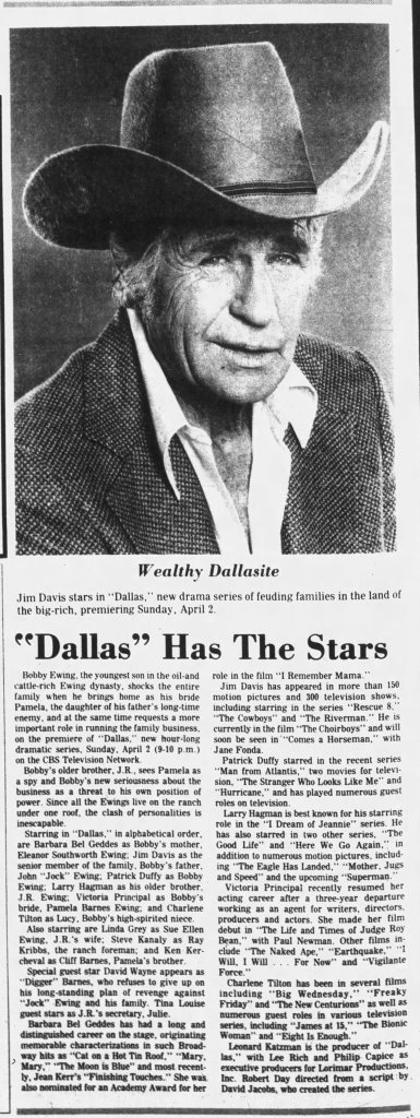 “Dallas” was a prime time CBS television series in the U. S. which ran for 14 seasons. It first aired in 1978 and ran its final episode in 1991. Internet Movie Database numbers the total episodes at 356. It was created by David Jacobs (1939 – 2023). The clipping below aired in various newspapers on or about April 2, 1978, timed to coordinate with the series premier, now called “Digger’s Daughter.”